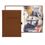 Elevate your brand with this semi custom bound journal. Features ribbon page markers, elastic pen loop and 125 sheets of lined paper. Customizable full color graphic page insert and blind deboss decoration included in pricing.