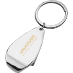 The Deluxe Bottle Opener opens bottles and flip-top cans and comes with a metal split key ring.