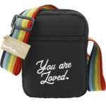 The Rainbow RPET Crossbody Tote features on-trend rainbow colors, a zippered main compartment and a zippered front pocket. The adjustable shoulder strap makes this crossbody perfect for anyone. Made from recycled water bottles, this crossbody is part of our EcoSmart collection. Through a partnership with 1% For The Planet one percent of sales of this and all EcoSmart products will be donated to nonprofits dedicated to protecting the planet.