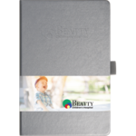 Elevate your brand with this full color, custom bound journal. Features a built in elastic closure, ribbon page marker, document pocket on back cover and 96 sheets of white paper. Customizable full color graphic page wrap and blind deboss decoration included in pricing.