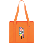 100g non-woven material with supportive board re-enforced on all sides including sewn in bottom board. This tote can completely collapse flat for easy storage when not in use. 12.5'' grab handles. Perfect for long-lasting use as a grocery tote or storage bin.