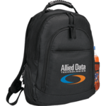 The Journey 15" Computer Backpack includes two zippered main compartments and a back compartment containing a padded laptop compartment with a hook and loop secured strap. The zippered front pocket includes a deluxe organization panel with multiple pockets, plus a side mesh pocket and media pocket with an earbud port. A reinforced heavy-duty rubber-trimmed top carry handle also make it easy to carry..